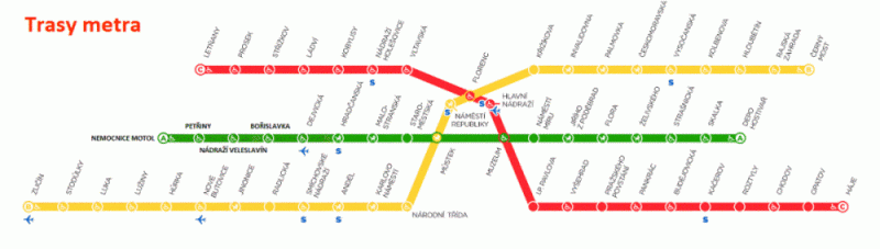 Last but not least, we also have metro! It’s not that old, it was actually open in 1974 and nowadays it has overall 62,5 km! We have three metro lines here – A (green), B (yellow) and C (red). People in Prague often call them just by the colors. There is another line of metro in discussion – its name should be – guess what – D and its color might be blue.