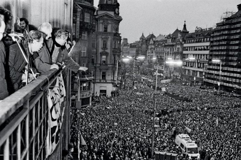 Václav Havel and other members of Občanské forum standing on a balcony above Wenceslas’ Square: https://www.reflex.cz/rok-1989-sametova-revoluce