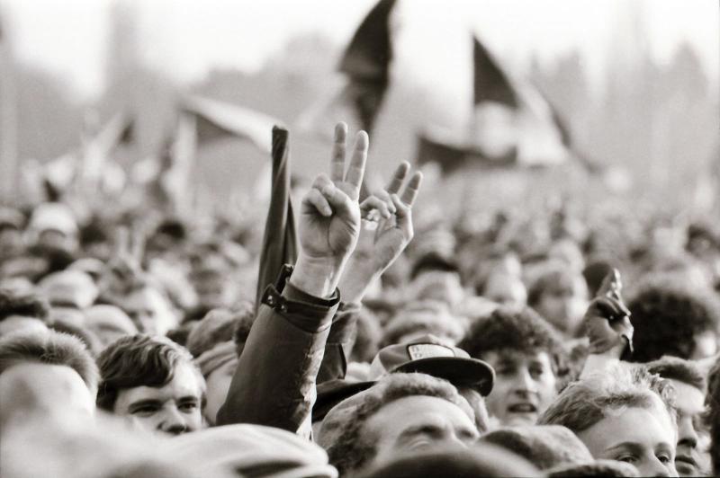 People raising their hands in a gesture meaning ‘Peace’ and ‘Liberty’: https://vysehradskej.cz/sametova-revoluce/